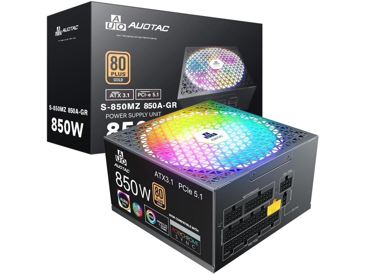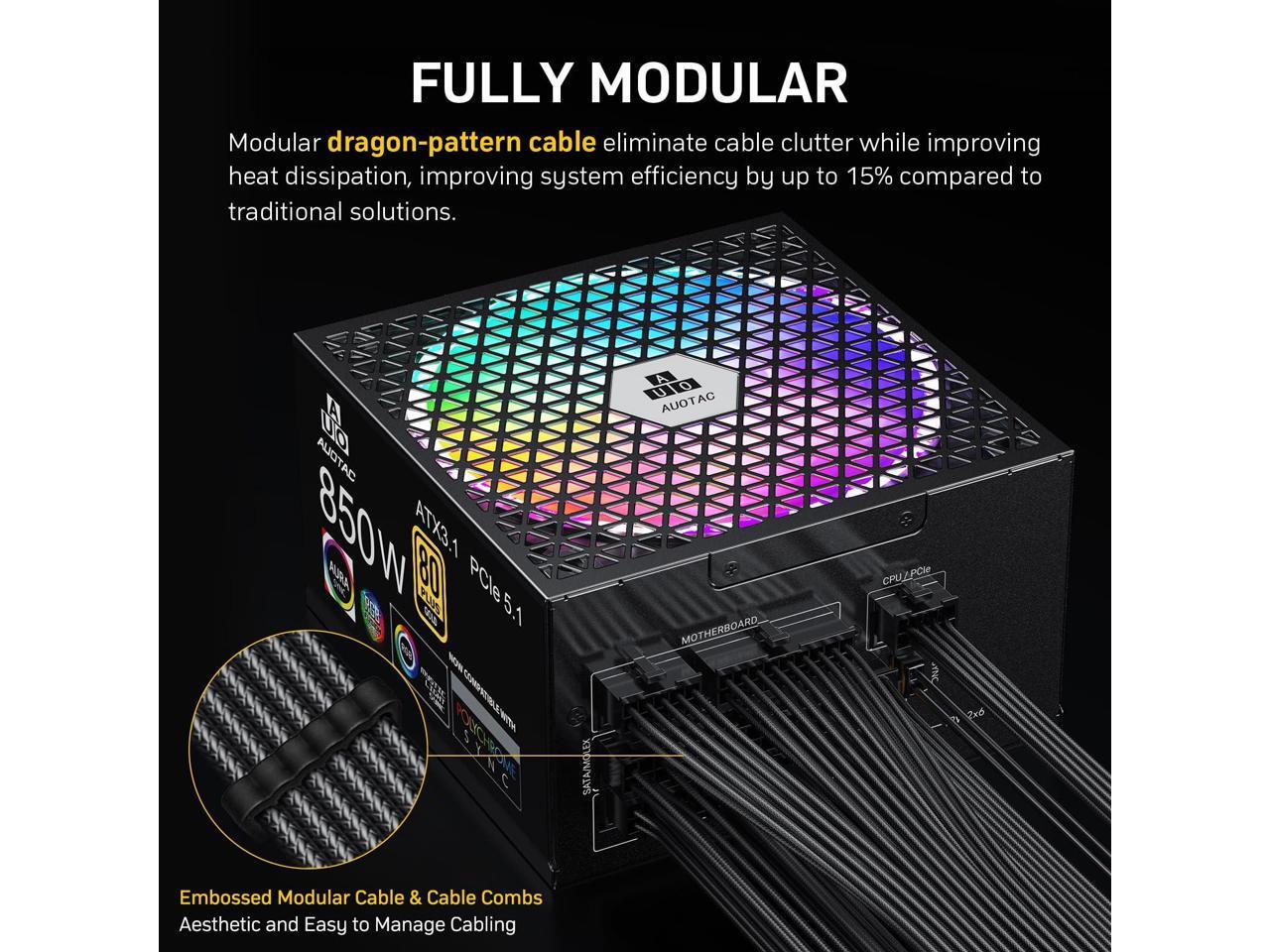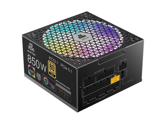 Auotac 850W Fully Modular Power Supply 80+ Gold Certified with 12V-2x6 Cable ATX 3.1 & PCIe 5.1 Compliant, 140mm RGB Low-Noise Smart Fan, 105-Rated Capacitors, Black