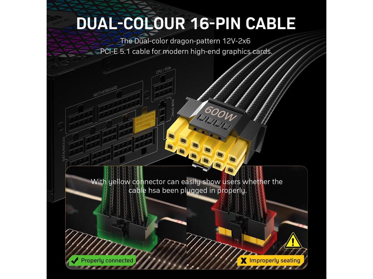 - Dual-Colour 16-Pin Cable: The Dual-color dragon-pattern 12V-2x6 PCI-E 5.1 cable for modern high-end graphics cards. With yellow connector can easily show you whether the cable has been plugged in properly.