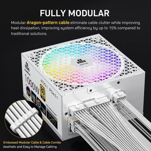 Fully Modular PSU: This reliable and efficient power supply is equipped with fully modular dragon-patterned cables. It can eliminate cable clutter, optimize air flow, and improve the overall efficiency and thermal performance of the machine.