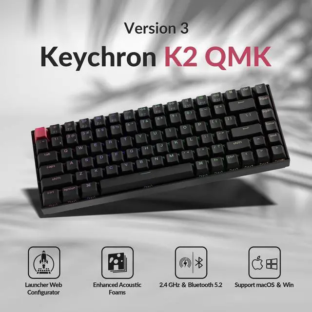 The Keychron K2 Version 3 features a popular compact 75% design, combining wireless and wired options. paired with shine-through double-shot PBT keycaps. its configurable through QMK firmware and the Keychron Launcher web app, offering endless customization possibilities.