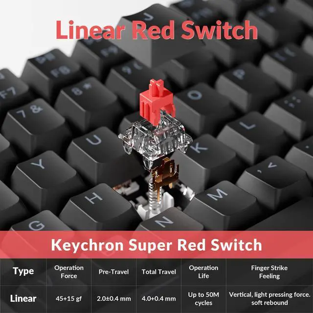Keychron Super Red Switch: This linear switch delivers a smooth, quiet typing experience with no tactile bump, perfect for fast typists and office environments.