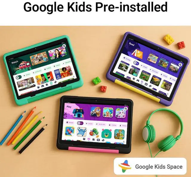 Smart Parental Controls & Kid-Safe Ecosystem Kids Tablet features advanced parental controls empowering parents to set up personalized profles, manage daily screen time limits, and curate approved apps and websites. lt comes preloaded with Google Play, YouTube Kids, and Google Kids Space-offering a secure digital plavaround where kids can learn and explore while parents maintain full oversight, Safety meets fun in every interaction.
