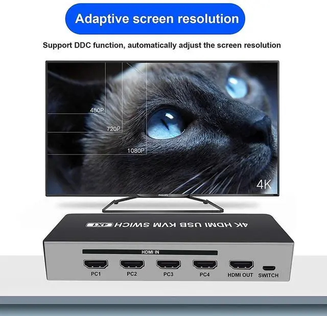 HDMI KVM switch four groups of high-definition Audio and video source and USB interface implementation free switch, Adaptive EDID, can adapt to a variety of complex application environments. The equipment has excellent image processing and transmission capacity, make the output signal is more smooth and steady, is a reliable, high performance and efficient way of HDMI USB switch.