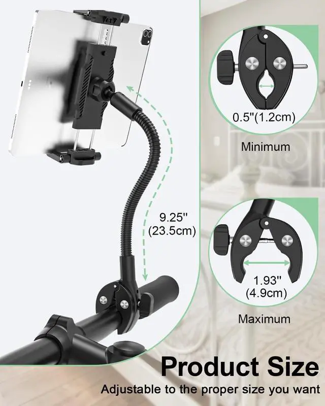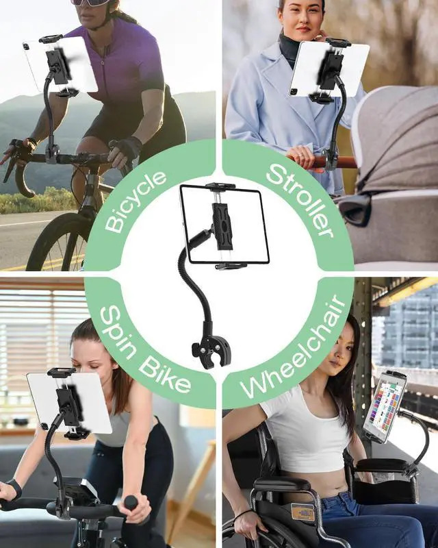 [Broad Clamp Application] This handlebar tablet mount has a clamp diameter of 0.5-1.93" (1.2-4.9 cm), suitable for most handlebars/rods/tubes, such as mountain bikes, spin bikes, treadmills, wheelchairs, boats, strollers, bicycles, scooters, motorcycles, etc.
