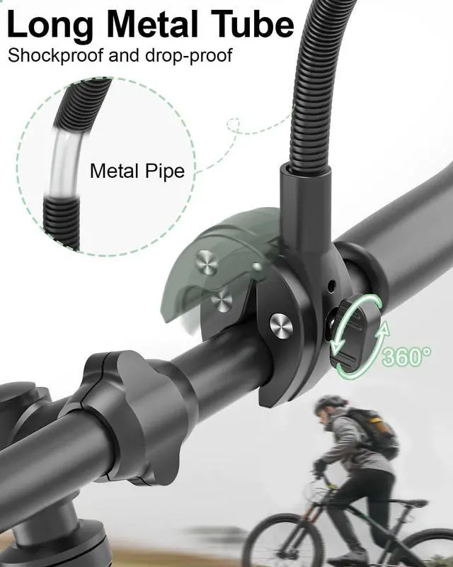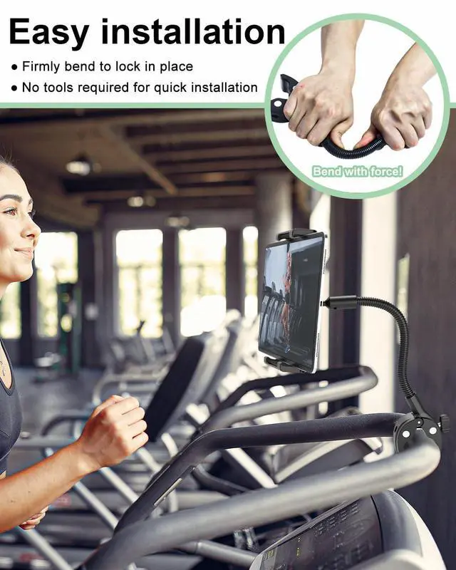 [Stable & Sturdy] The gooseneck tube of this exercise bike tablet holder is crafted from aluminum alloy, staying stable during intense exercise. Its handlebar clamp with rubber pads firmly grips, preventing scratches on the handlebars and keeping your device safe.