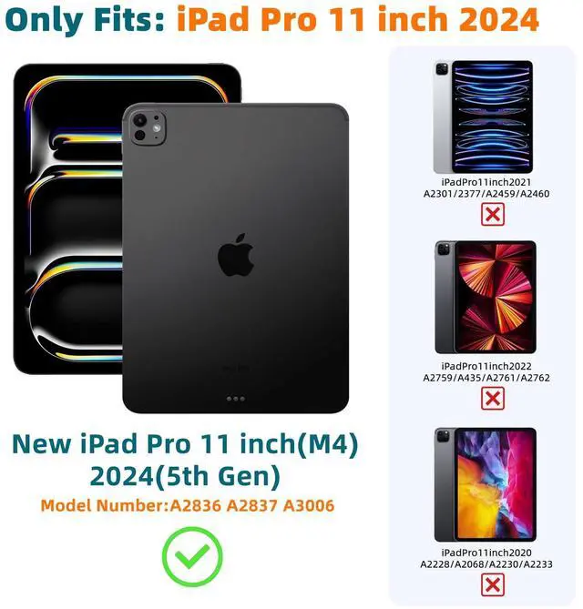 Only for iPad Pro 11-in M4This Case is only for iPad Pro 11-in (M4) 2024 new release, models: A2836, A2837. If your iPad Pro 11 inch is not the latest release in 2024, please choose size: Pro 11" (4/3/2). To ensure you buy a right case for your iPad, please verify the model number "AXXX" on the bottom of your iPad before purchasing. If you have any questions about the compatibility, please feel free to contact us