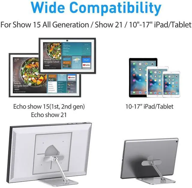Compatible DevicesWe design this tilt stand to work with the Echo Show 15 smart display(Device is not included) and up to 18 inch iPad/Tablets. The stand base can also be used as desktop storage organizer for jeweIry, key and coin