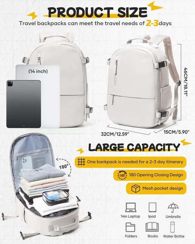 Vacuum Travel Backpack: This travel backpack size (L * W * H) 32*15*46cm(12.59*5.9*18.11 inch).Carry on Backpack suitable for air travel, easy to place under luggage racks or seats.The trolley sleeve works with luggage to make traveling more convenient.
