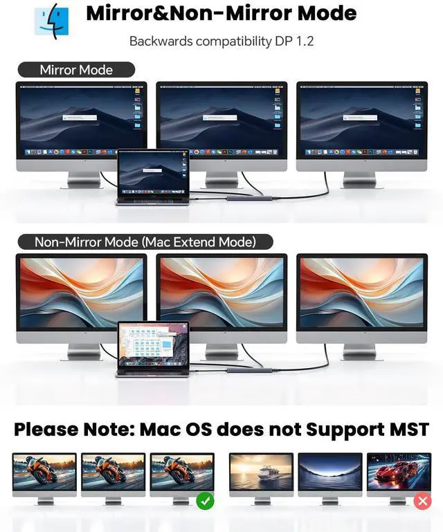 Docking Station 3 Monitors - This usb c docking station only Windows System support Mirror & Extend Mode, HDMI and display port support up to 4K@60Hz. For Extend mode, MAC OS can Only Extend One Monitor (4K@60Hz).