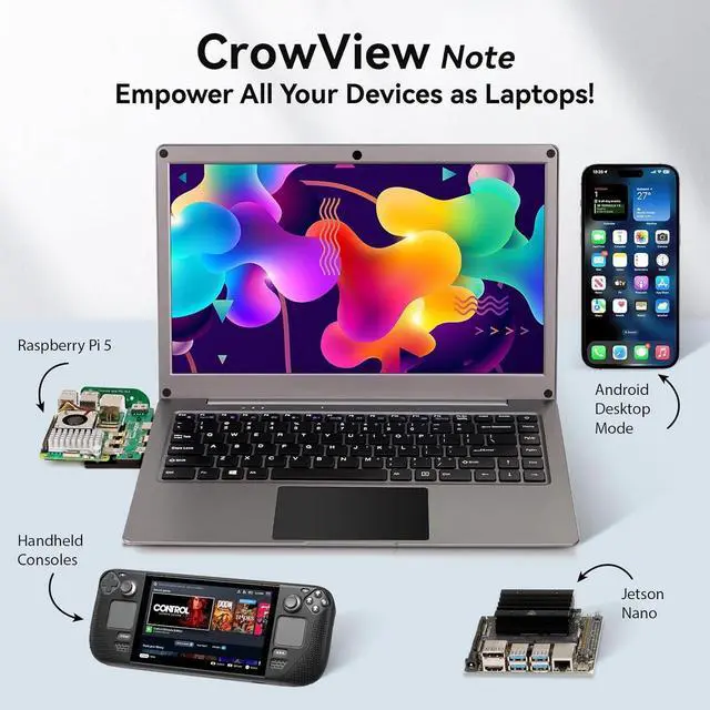 Phone to Laptop:Connect your smartphone to CrowView Note and unlock its desktop mode. The larger screen delivers an immersive experience for your entertainment and work, such as video conferences, email management, and web browsing, enhancing your phone's efficiency and functionality.