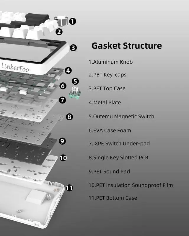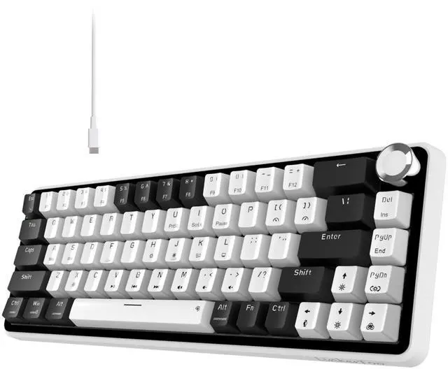 The LF67s gasket mount combines flexibility and stability with five layers of sound-dampening material including Poron foam to minimize vibration and enhance typing acoustics. Enjoy a deep, thocky sound and a cushioned keystroke feel, ideal for both gaming marathons and work sessions. 3. Premium Aluminum Volume Knob & Smart Indicator Lights