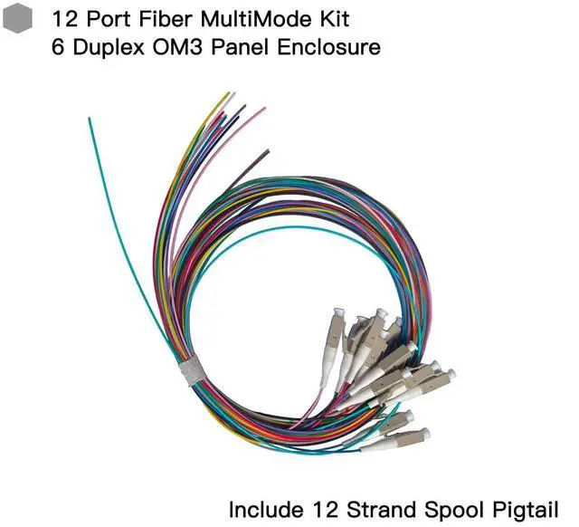 The complete kit includes a 12-strand LC-UPC OM3 pigtail and a 6-port duplex OM3 LGX load panel for organized fiber management.