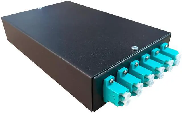 The black metal housing features 6 duplex LC-UPC ports supporting OM3 multimode connectivity, accommodating up to 12 cores total.