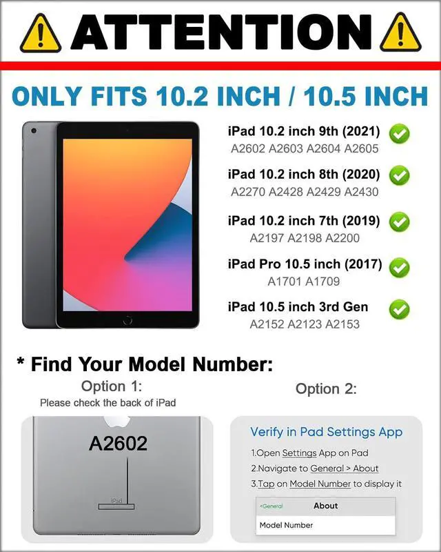 Wide CompatibilityThis iPad keyboard case is compatible with iPad 9th Gen 2021 10.2 inch (A2602/ A2603/ A2604/ A2605), iPad 8th Gen 2020 10.2 inch (A2270/A2428/A2429), iPad 7th Gen 2019 10.2 inch (A2197/A2200/A2198), iPad Air 3rd generation 10.5 inch 2019 (A2152/A2123/A2153), iPad Pro 10.5 inch 2017 ( A1701/A1709). NOT compatible for any other iPad models. (Please check the model number starting with "A" on the back of your tablet before purchasing.)