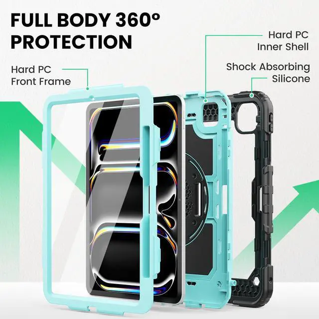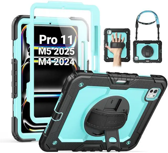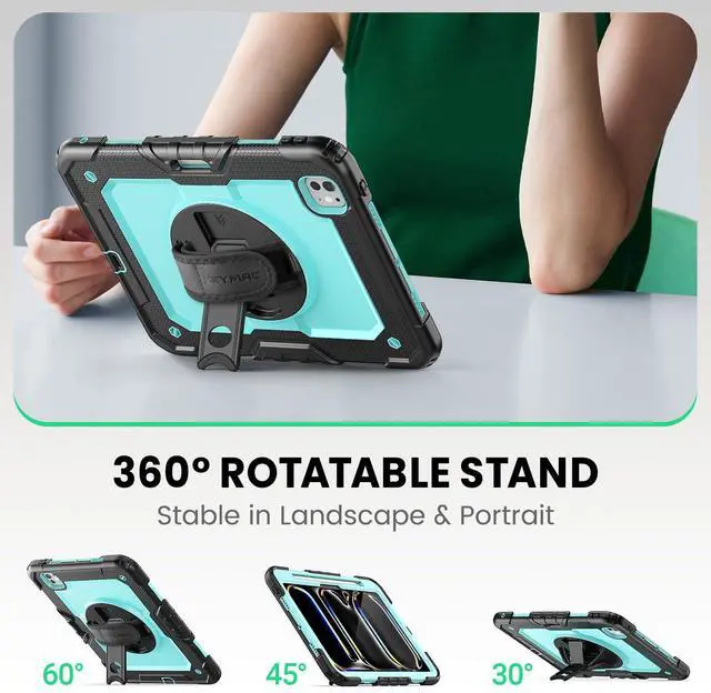 SEYMAC for iPad Pro 11 Inch Case M5 2025 / M4 2024, Heavy Duty Shockproof Protective Case with Screen Protector, 360° Rotating Stand, Hand/Shoulder Strap and Pen Holder, Light Blue