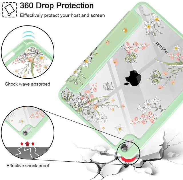 May Chen Slim Case for iPad mini 7 (A17 Pro, 7th Generation) 2024 / iPad mini 6 (6th Gen) 8.3 Inch, [Built-in Pencil Holder] Shockproof Cover Clear Clear Back Shell Auto Wake/Sleep, Green Flowers