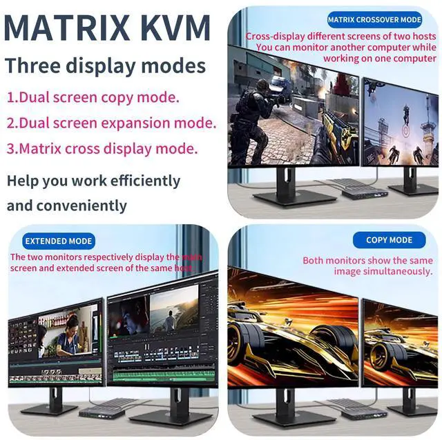 PC2 Switch mode 3: Right Ctrl+Right Ctrl+[3]+Enter Switch to PC1A+PC2A Matrix mode, hdmi Cross output and USB follows