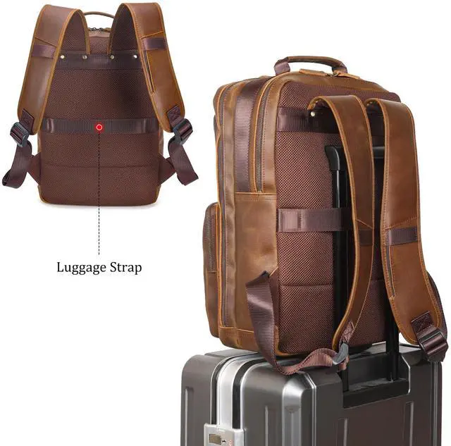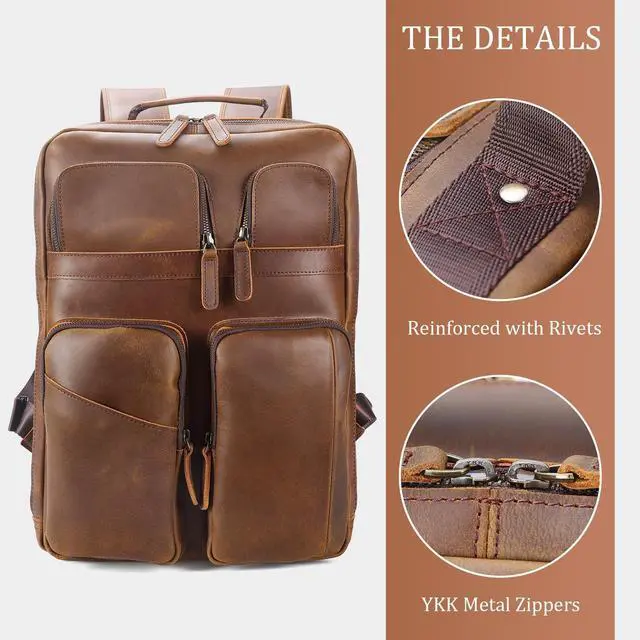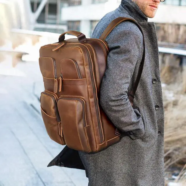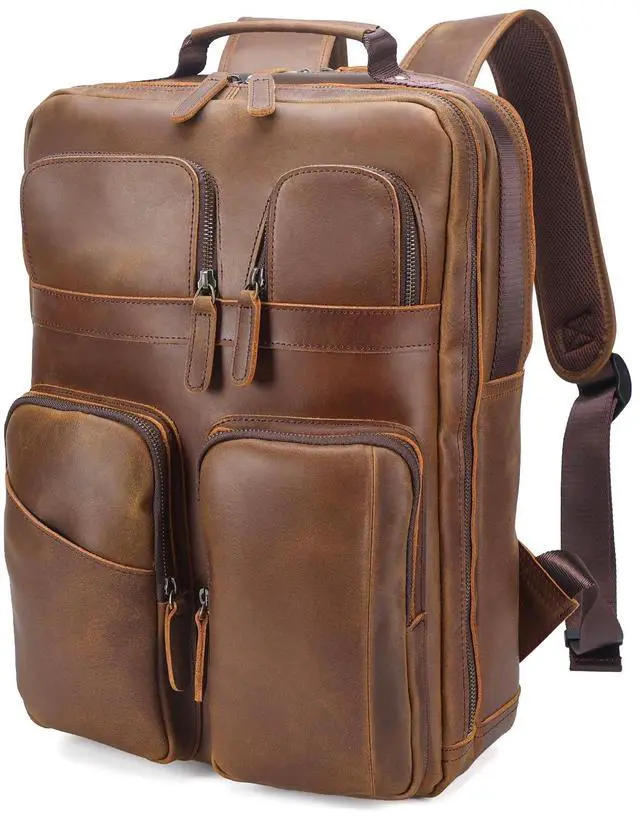 Polare 17.3 Inch Full Grain Leather Backpack for Men and Women Multi Pockets Business Travel Laptop Rucksack (Light Brown)