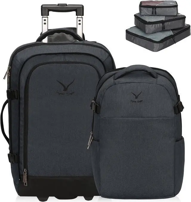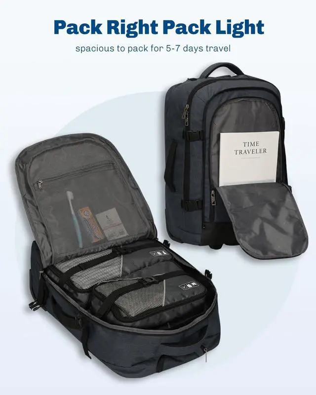 Hynes Eagle 2 in 1 Travel Backpack 22 inches Carry on Luggage 63L Rolling Backpack for Men Women with Packing Cubes 3PCS Set Gray Blue