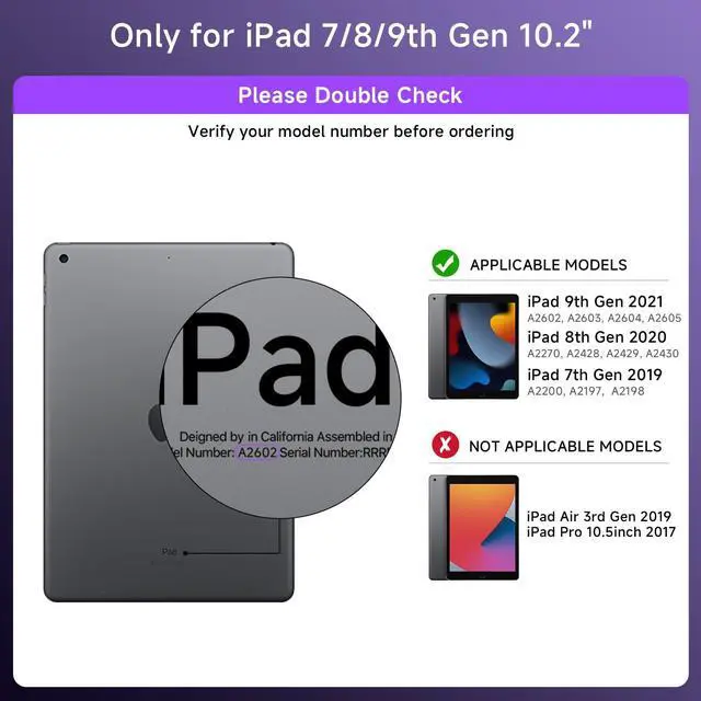 Compatibility: Compatible with iPad 9th Gen (2021, 10.2 inch) Models A2602 A2603 A2604 A2605; iPad 8th Gen (2020, 10.2 inch) Models A2270 A2428 A2429 A2430; iPad 7th Gen (2019, 10.2 inch) Models A2200 A2197 A2198; Please check your iPad model number on the back of your device (starting with "A") before purchasing to ensure compatibility.