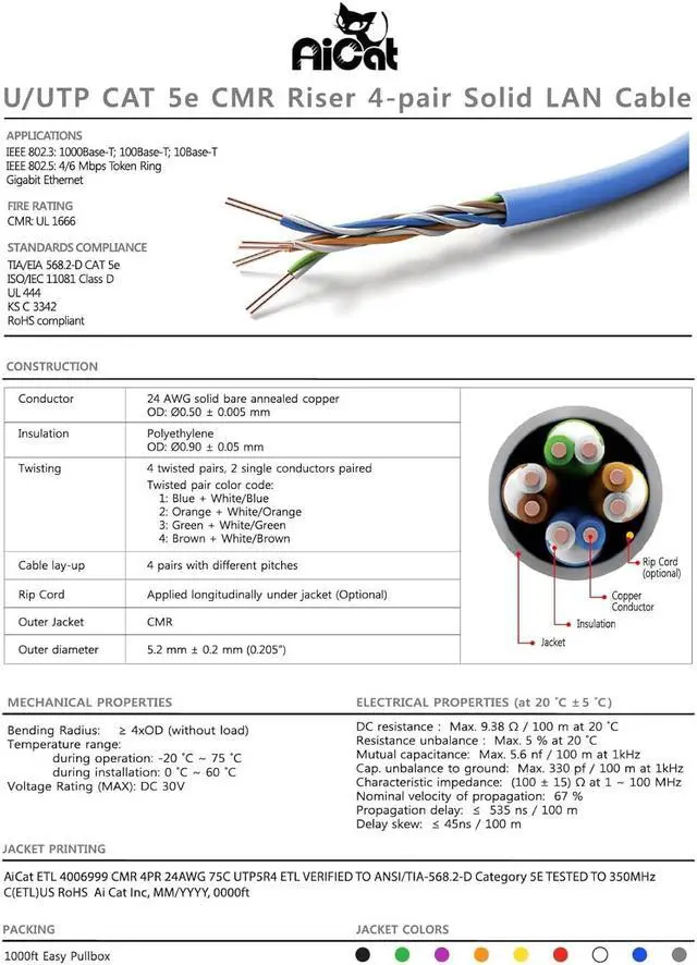 100% CERTIFIED SOLID BARE COPPER CONDUCTOR: Its time to forget Copper Clad Aluminum cables (CCA) With a higher conductivity and tensile strength, AiCat. 24AWG Solid Copper Conductors transmit faster while lasting the distance. For heavy traffic networks, and as a solid computer ethernet cable - it just makes perfect sense