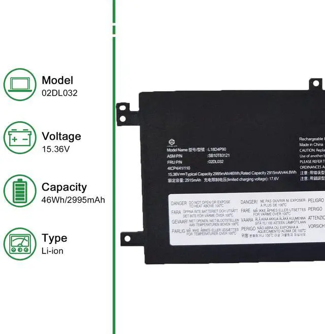 • Model: 02DL032 // Voltage: 15.36V // Capacity: 46Wh 2995mAh // Color: Black // Type: Plug & Play Li-ion Battery.