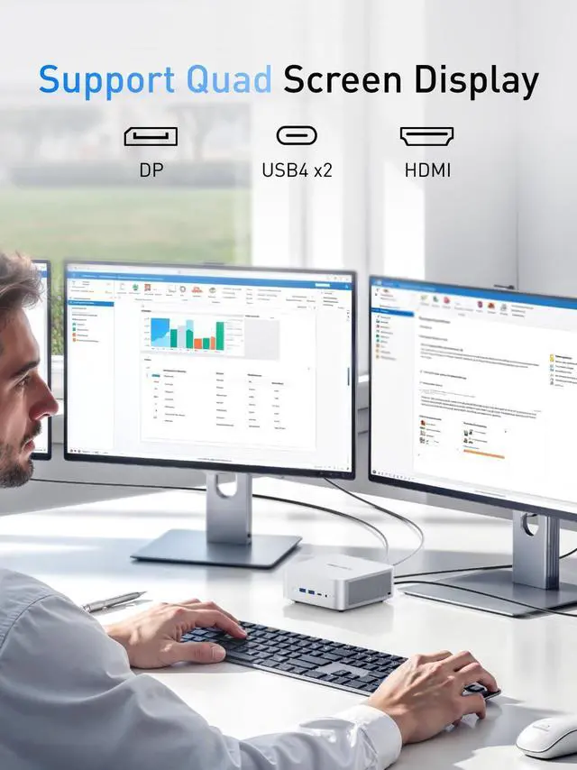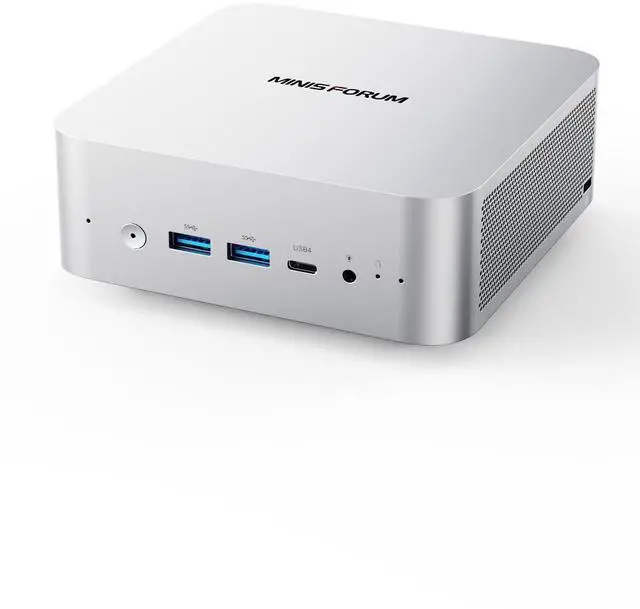 Comprehensive Connectivity: MINISFORUM AI mini computer desktop support 3-screen display with HDMI2.1 TMDS x 1 (Up to 4K@60Hz)/DP1.4 x 1 (Up to 4K@120Hz/4K@240Hz )/USB4 2 (Up to 8K@60Hz/4K@120Hz) , 2.5G LAN and Wi-Fi 7/BT 5.4, ensuring low-latency stable connection, built-in microphone and dual speakers, making your communic
