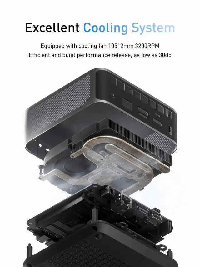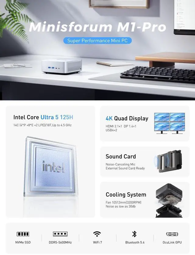 Leading AI Mini PC: AI M1 Pro-125H is equipped with Intel Core Ultra 5 Processor 125H 14 cores, 18 MB Intel Smart Cache, up to 4.5 GHz and Intel Arc graphics, providing excellent multi-threaded computing and smooth HD graphics processing experience, meeting the needs of heavy office, light gaming and multimedia editing.