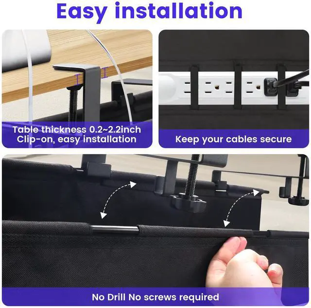 Durable & SpaciousMade with carbon steel frame and 600D Oxford fabric, this under desk cable management tray is heat-resistant, tear-proof, and holds up to 22 lbs (10kg).
