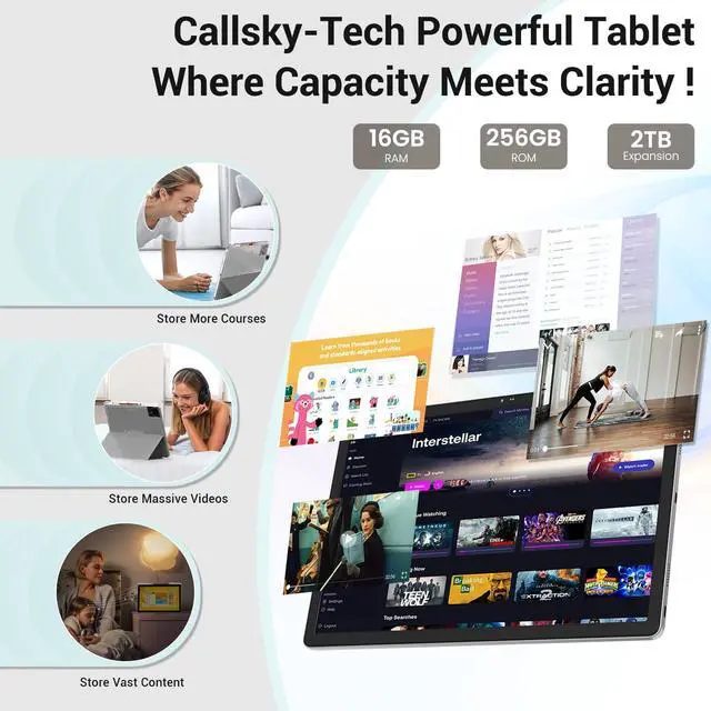 IMMERSIVE 14-INCH HD VIEWING EXPERIENCECallsky 14 inch tablet comes with 16GB RAM and 256GB ROM and features a 1920x1200 IPS screen with anti-glare film for better eye protection, and four stereo speakers for immersive movies and learning, crystal-clear audio with rich bass enhances your viewing experience.
