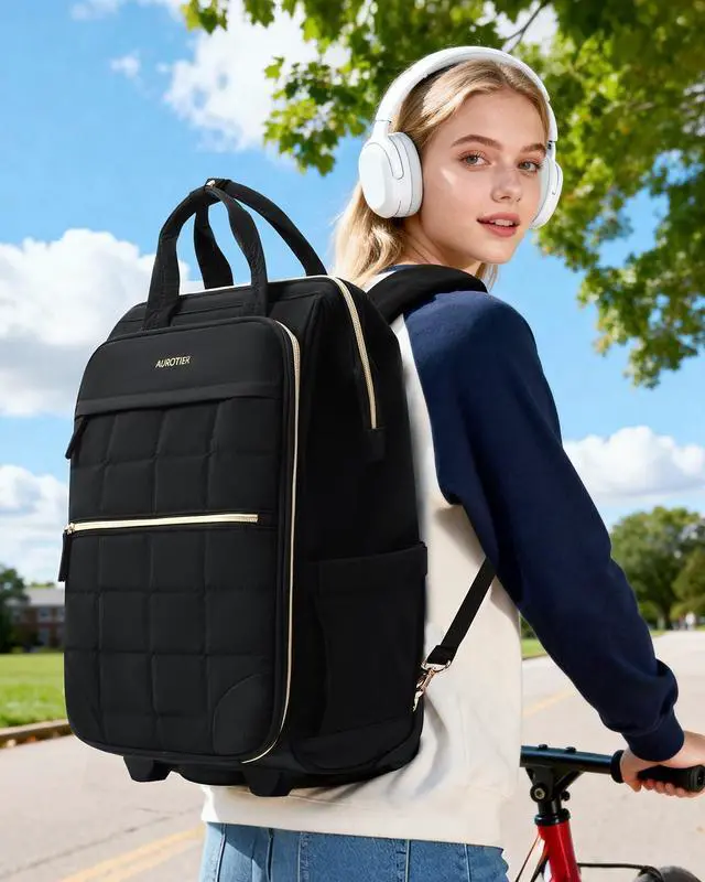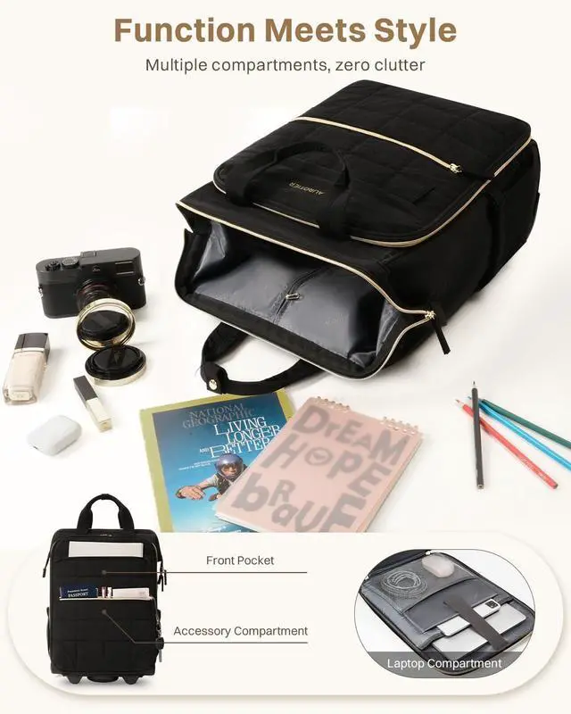 Smart Organization with Dedicated Laptop Section: Stay effortlessly organized wherever you go. This rolling backpack for women features multiple thoughtfully designed compartments a roomy main section for clothes or books, a padded laptop compartment with anti-shock protection, and a front organizer pocket equipped with pen holders, small pouches, and a handy key leash. No more messy packing just smooth, stress-free organization for your day