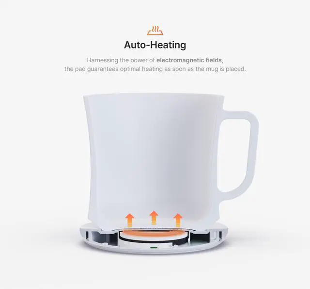 Smart & Simple Design Automatic on/off when the mug is placed. No confusing buttons. Indicator light can be switched off. Spill-resistant ceramic mug with lid for maximum heat retention.