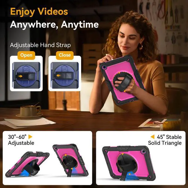 360° Swivel Stand and Adjustable Hand StrapThe 360° swivel foldable stand provides multiple angles (30°/45°/60°) for easy viewing, typing or drawing. This wristband is adjustable and swivel for one hand display. makes you using cover for Samsung Galaxy Tab A9+/A9 Plus 11 inc
