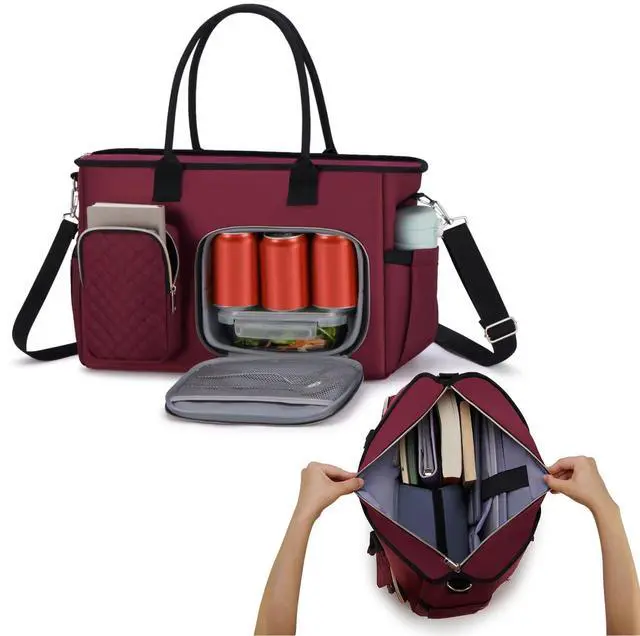 Women Laptop Tote Bag with Insulated Lunch Compartment,15.6'' Teacher Work Computer Bag,Large Water-Resistant Messenger Shoulder Bag with Multi Pockets for Office/College/Travel-Wine Red