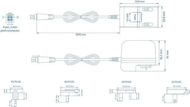 Exchangeable plugs: EU (Type C), US (Type A), UK (Type G) and AU (Type I) included - 100-240 VAC input, 9 VDC output - 50/60 Hz