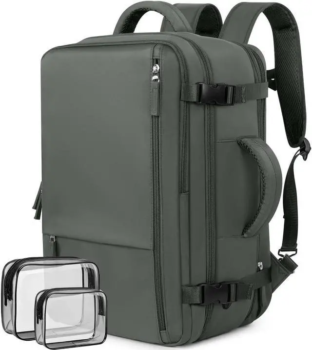 Large Capacity and Multi PocketsCarry on backpack with large storage capacity and two extra toiletry bags. Multiple zippered pockets give you plenty of storage space, including a front pocket, waterproof section, main compartment, separate laptop compartment, and anti-theft pocket on the back. In addition, this traveling backpack also has a mesh slip-in pocket with elastic closure on the left side for a bottle or an umbrella