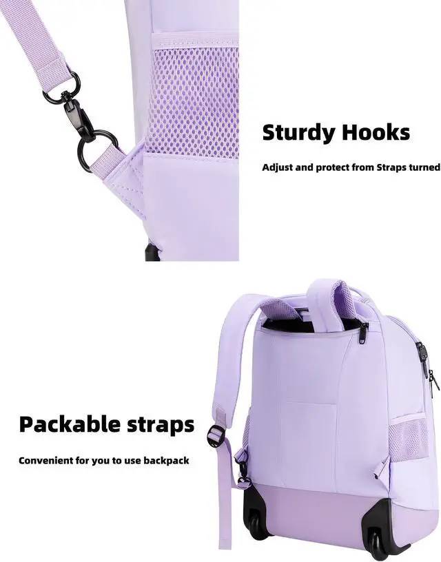 DESIGN: Water-resistant bottom panel Corner guards and a kick plate protect the bag from abrasion; Corner-mounted smooth wheels make it easy for women to carry; Metal swivel hooks can be adjusted at any time, protect from straps are turned; Padded mesh back straps provides you back support to ensure a comfortable carrying experience; The lockable metal zipper design allows you to lock the wheeled backpack with your own lock which can safely protect your valuables from thieves