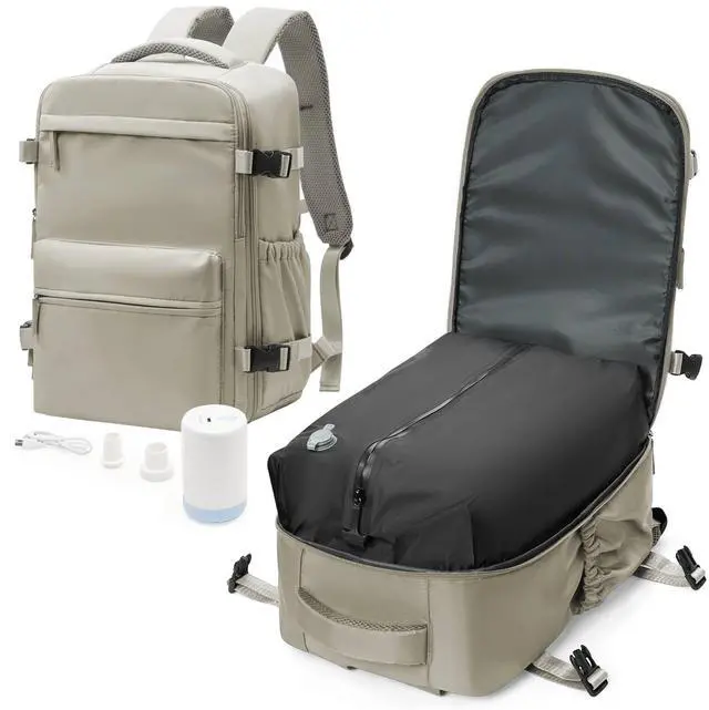 Vacuum Travel Backpack with Pump for Women,Personal Item Carry on Backpacks Flight Approved 18x14x8 inches for Men,Laptop Waterproof Work Compression bags Casual Daypack GreyBrown