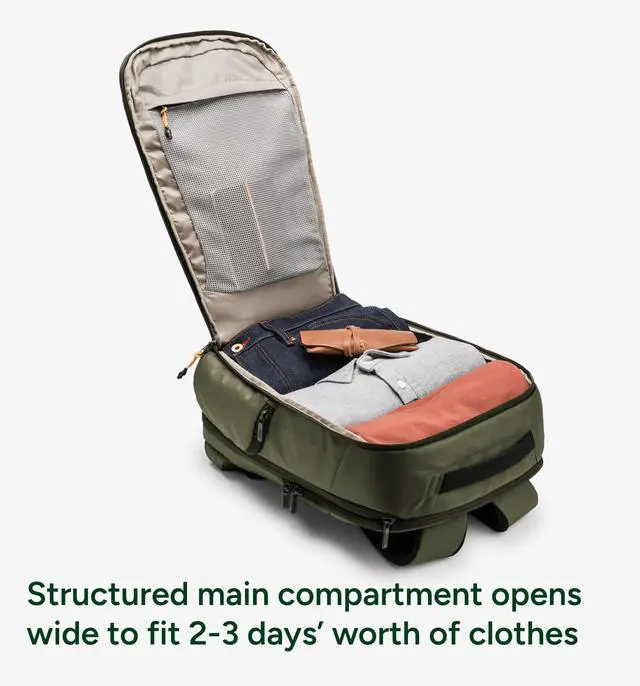 Think: quick business trips or slipping out of the office early to jumpstart a long weekend. Its structured main compartment opens wide to fit 2-3 days worth of clothes and the back laptop pocket ensures your tech arrives safe and sound. Finished with an interior pouch for laundry or extra shoes, padded shoulder straps, and built-in lumbar support to ensure you never get tired of adventuring.