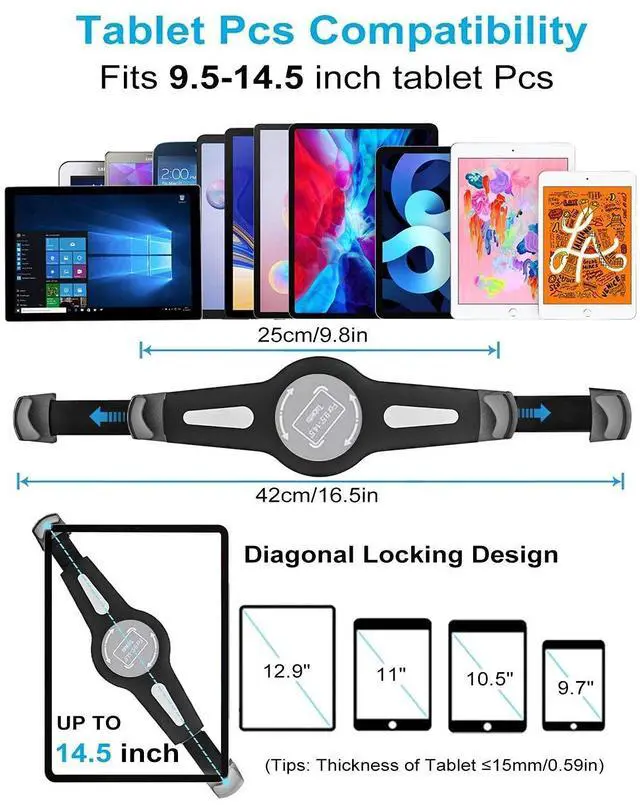Broad compatibilityThis universal non-slip tablet holder bracket fit large tablet. Compatible with all All 9.5~14.5 Inch tablets, such as new iPad Pro 9.7 / 10.5 / 11, iPad Air 2 / 3 / 4 / 5 / 6, iPad Mini 2 / 3 / 4 / 5 / 6 / 7, iPad 2024 / 2023 / 2022 / 2021 / 2020, iPad 10th / 9 / 8 / 7 / 6 / 5, Galaxy Tab S, Galaxy Tab A; Fire HD; Surface Pro / Go; Nexus Tablets; Android Tablet PC series.