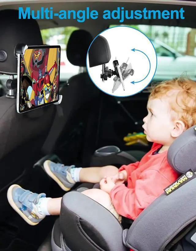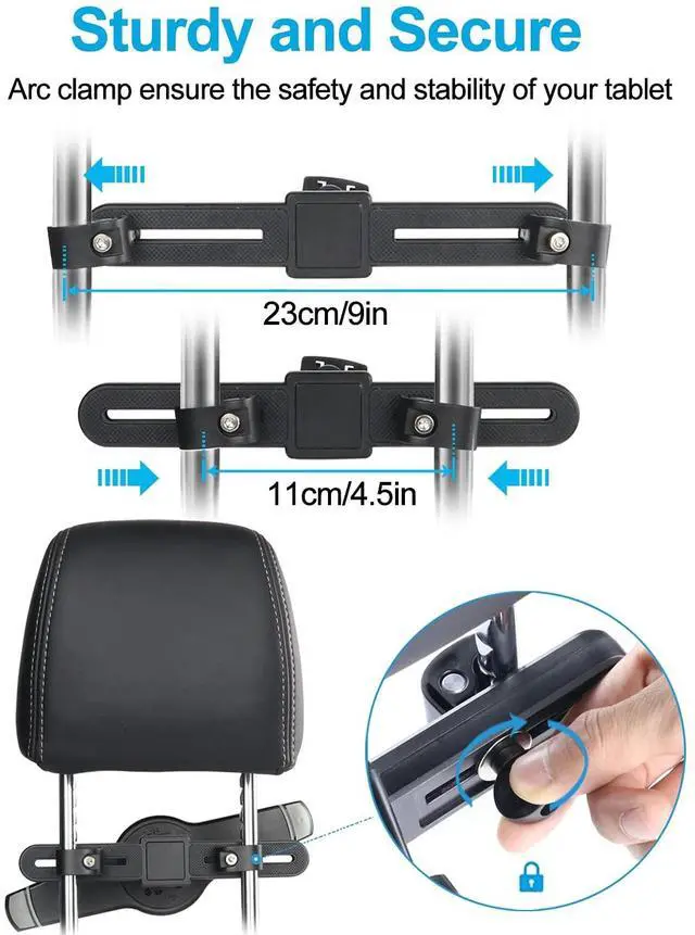 Secure MountingThe adjustable arm extension will securely attach to headrest posts distance between 4.53in to 8.86in.With This car back seat tablet holder,it will provide a comfortable viewing experience to kids or passengers.