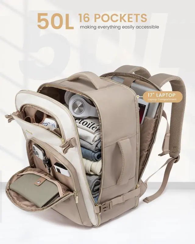 • Carry on Backpack Opens Like a Suitcase: 180°opening design, fully opened zip closure, you can rummage through your clothes without destroying everything, utilizing every inch of space. Total of 4 compartments and 16 pockets make everything easily accessible. Pack 3-7 days worth of travel essentials for women with ease. 50l travel backpack for women men: 20*14*8 inch weight: 3.85 LBS.