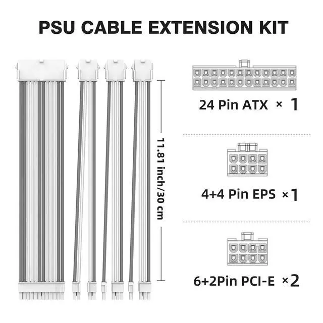16AWG PSU Cable Extension Kit with Cable Combs, 1x24pin ATX/1x8pin(4+4) EPS/2x8pin(6+2) PC Sleeved Cables 30cm Length, Power Supply Extension Cable Kit(White/Gray)