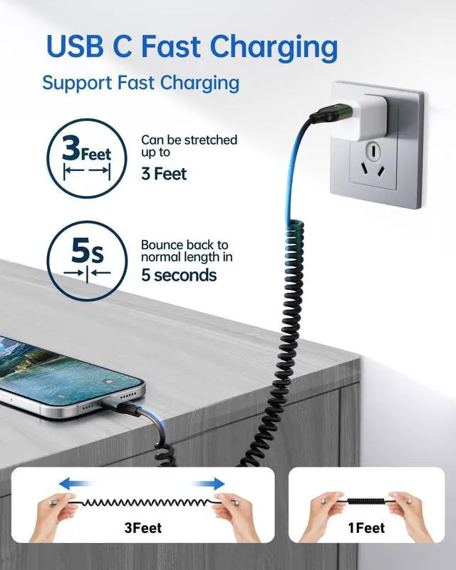 USB C Cable for Car This coiled USB A to USB C fast charging cable is portable and easy to use. It can save a lot of space in the car and bid farewell to the troubles of chaotic and tangled charging cables. ^^ iPhone 17/16/15 USB A to USB C Cables The coiled usbc charger cable natural length is 1.3 feet, stretchable to 2-3 feet (comfortable length), up to 4 feet. As a shorter expanded cord, its compact ability is more organized than a single straight cord. ^^ 66W USB C Cable Fast Charging and Data Sync E-Mark chip for safer charging.