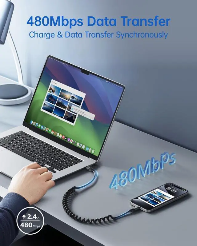 This USB-C Cable fast charges up to 60W, up to 3.0 A fast charging and up to 480 Mbps data transmission efficiency. ^^ Keep Your Car Clean and Tidy You will find it easier to keep your phone in spot in your car instead of all over the place. it is much neater and more convenient than a straight cable in your vehicle. The usb-c cables stretch out when you need them, but coil right up when not in use. The coil saves space and work well in a vehicle, a recliner, or in a home office.