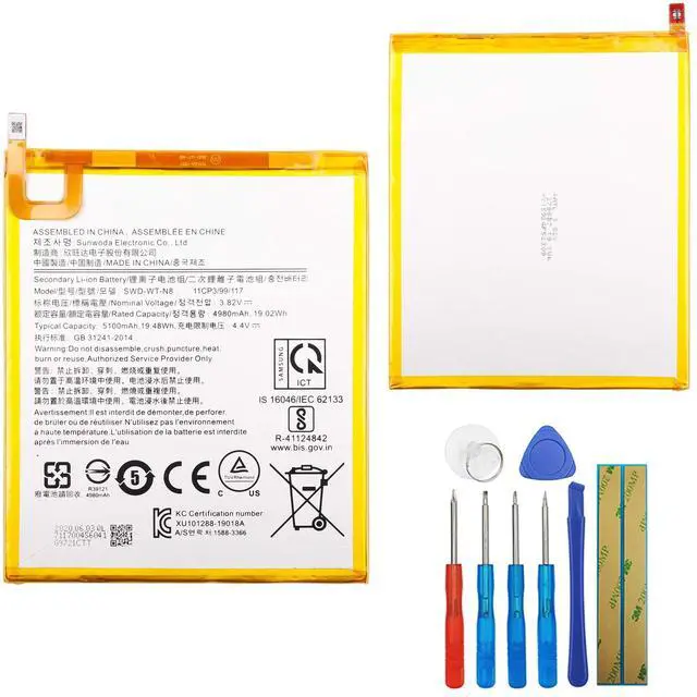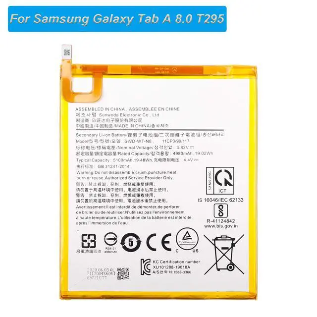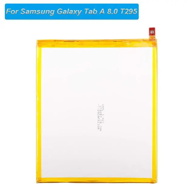 PolymerPackaging: 1 x battery, 1 x ToolsCompatible withSamsung Galaxy Tab A 8.0 T295 T290Notice before purchase1. Be carefully check the model number of your device to see if this battery is compatible with your device. 2. A new Li-ion battery will achieve its best performance after 2 or 3 complete cycles of charge & discharge. 3. When you install it, be sure the connector has been properly connected to your device. 4. Do not use low quality third-party adapter charger to charge your device, that will shorten the battery's life. Contact usIf you have any questions or any issues when using our product, please send us a message, we will answer you within 24 hrs. Thank you for your time.