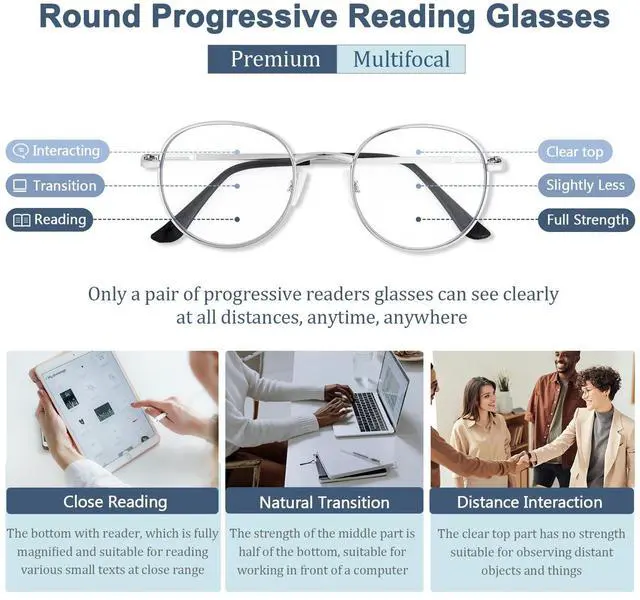 • Photochromic progressive reading glasses lenses achieve clarity at different distances. The upper part is zero strength for distance viewing, the middle part is for working in front of the computer, and the bottom part is for close reading. Progressive multifocus reading glasses avoid the trouble of frequently changing glasses