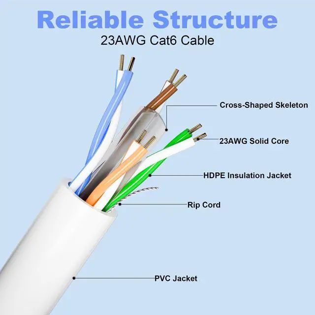 ^^ Superior Construction: Our Cat 6 Ethernet cable features 4 pairs of CCA conductors (23 AWG). Each of the 4 unshielded twisted pairs (UTP) are separated by a cross skeleton in the middle to prevent mutual interference. This construction can effectively reduces electromagnetic interference (EMI) and radio frequency interference (RFI), providing a stable data transmission.
