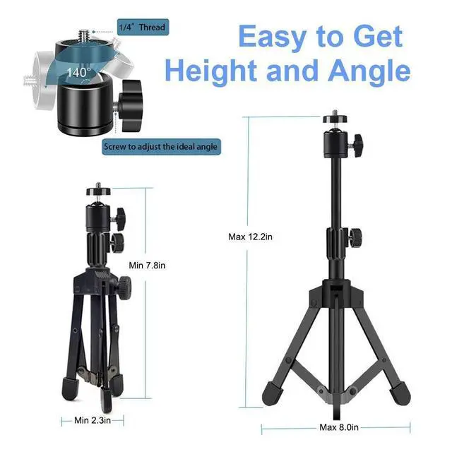 Super Sturdy and DurableUnlike other shaky webcam stands, JCWINY webcam tripod stand is made of strong metal and highly-durable ABS plastic, and designed with non-slip rubber pads to ensure the tripod remains stable, offer maximum stability for your devices avoiding annoying bouncing while filming or surfing and protects your valuable device from tipping over. ^^ Extendable Height and AngleThe desk webcam mount is designed with two adjustable height levels. You can extend the height from 7.5 -12 inches. The tripod head ball-joint allows for 360-degree rotation and up to a 90-degree tilt. ^^ Compact and Foldable Weighing in at just 260g/ 0.57 lb, with a foldable height of 7 inches.