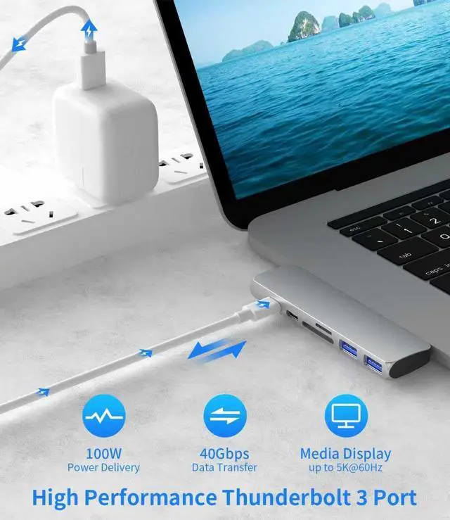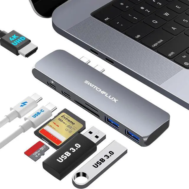 7 in 2 USB C Hub Expands your MacBook's two USB-C ports into one versatile Thunderbolt 3 port, one USB-C data port, one 4K HDMI port, two USB 3.0 ports, and an SD/TF card reader. Designed specifically for MacBook Pro/Air (2016-2022 models), it significantly expands your laptop's functionality and boosts productivity